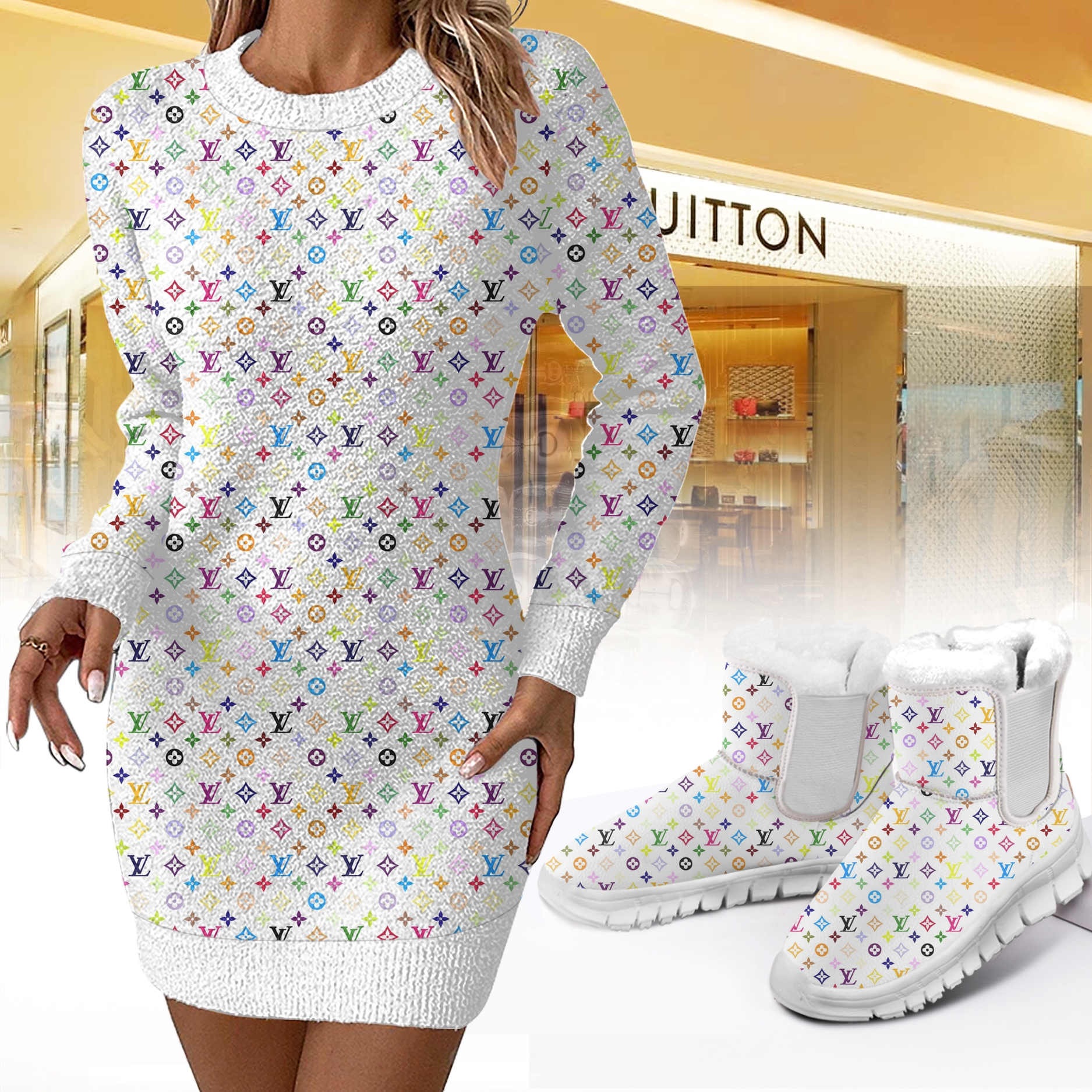 Luxury Louis Vuitton Women Sweater Dress And Snow Boots AZ23102508